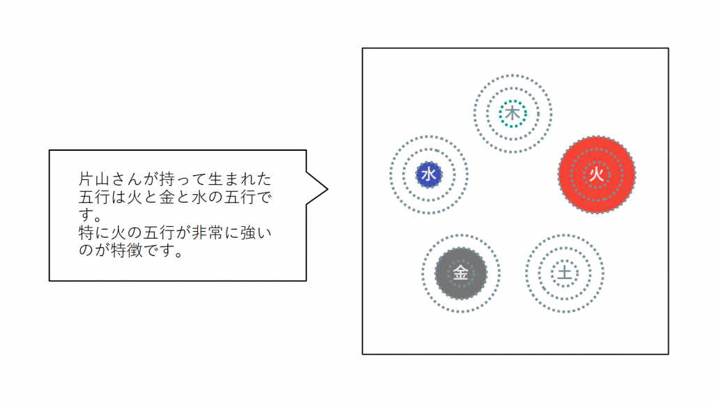 片山さんが生まれ持った五行のバランスを見ると、火の五行が突出して多く、次いで金の五行と水の五行をお持ちです。