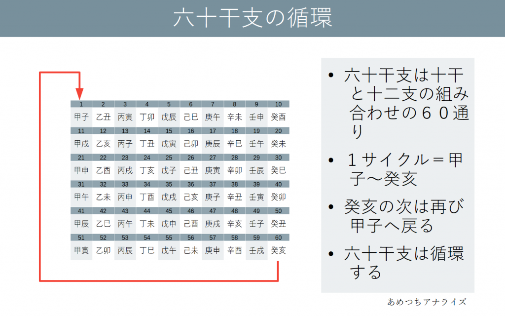 癸亥で1サイクルが終わると、次はまた甲子に戻り、同じように60通りが繰り返され循環していきます。