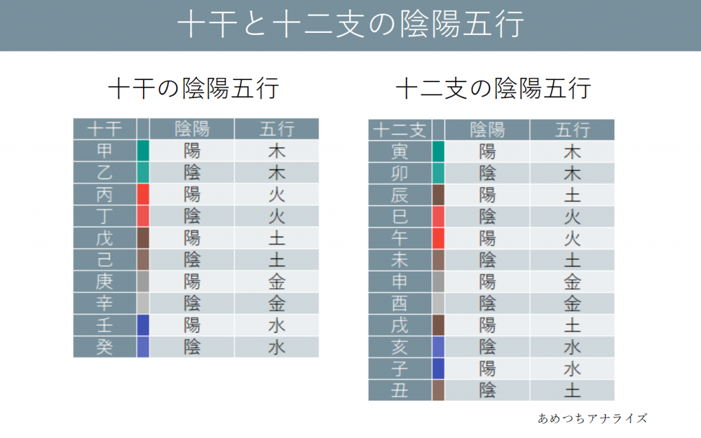 陰陽五行説の発展の歴史の中で、当初日付や時間、方位を表すための符号として使われていた十干と十二支に対し、それ自体に陰陽五行が配当されるようになっていきました。十干と十二支の陰陽五行の配当は次の通りです。