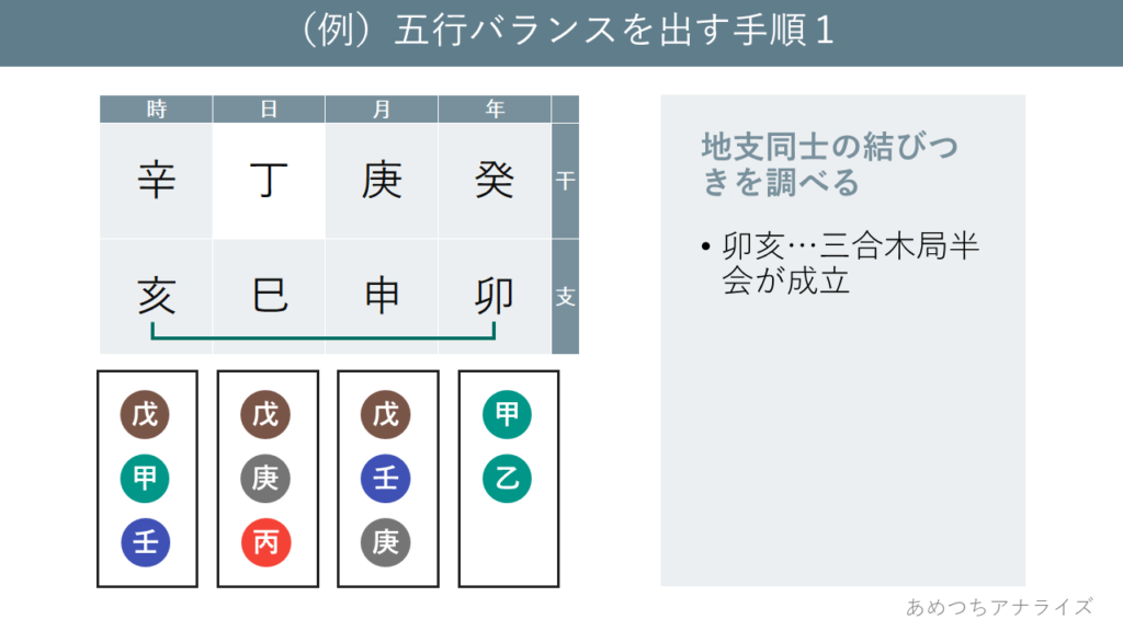 まずはじめに、命式内の4つの地支に対して、十二支の法則が成り立つかどうか調べます。卯・申・巳・亥の中で、互いに結びつくものは卯・亥の1組のみです。卯と亥は三合木局半会の関係であり、2つが結びつくことで木の五行が強まります。