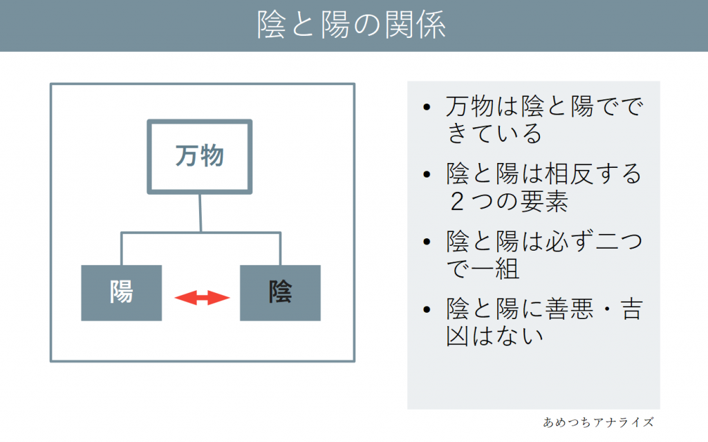 陰陽説の注目すべきところは、陽が良くて陰が悪いといった善悪で分ける二元論ではないことです。