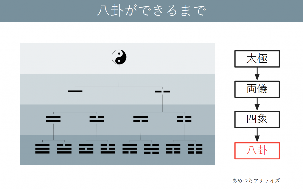 八卦は、森羅万象を陰と陽で分類していき出来上がった、8種類の基本グループだと言えます。