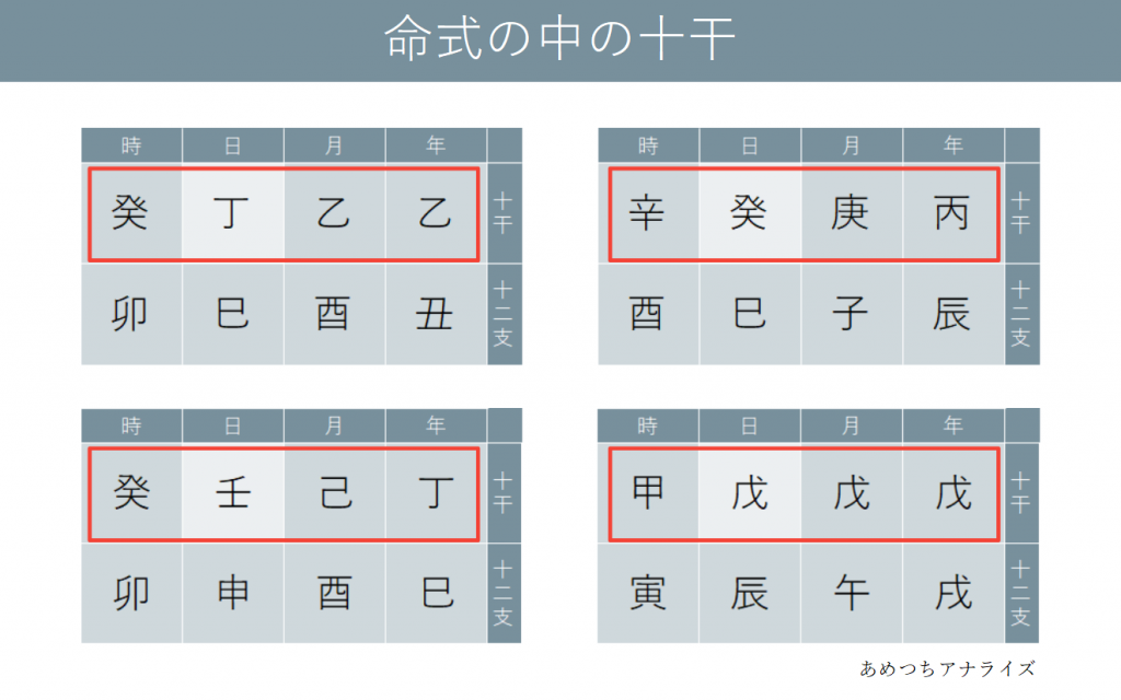 四柱推命の命式の中には4つの十干が含まれます。この4つは全て異なる場合もあれば、同じものが偏っている場合もあり様々です。