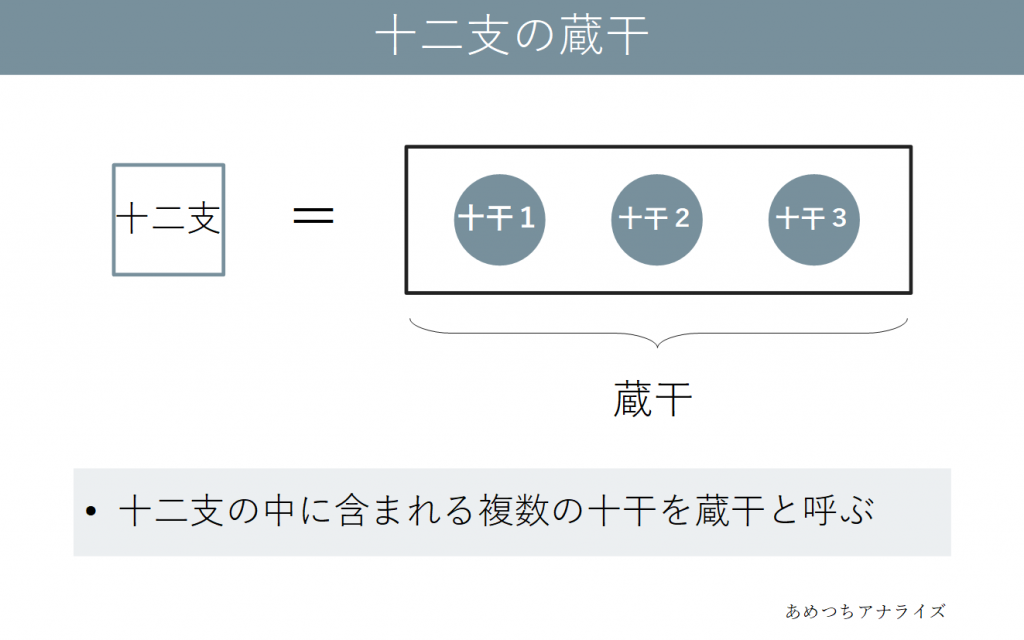 四柱推命では、ひとつの十二支の中に2~3個の十干が含まれると考えます。これは「十二支が十干を内蔵する」ということで「蔵干(ぞうかん)」と呼ばれます。