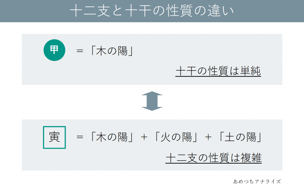 十干が単一の陰陽五行からできているのに対し、十二支は複数の陰陽五行からできており、その性質は十干に比べて複雑で多様です。