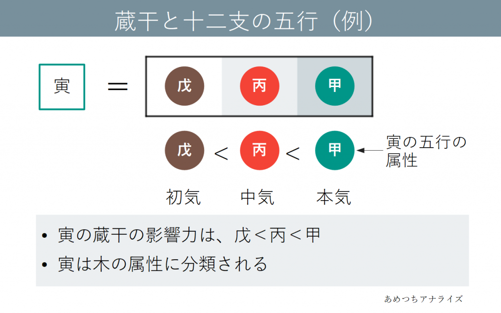 また、十二支には複数の陰陽五行が含まれるため、十干のように一対一に対応する陰陽五行を割り当てることが難しくなります。そのため、一般的には蔵干の中で最も影響力のある十干の五行をとって分類します。