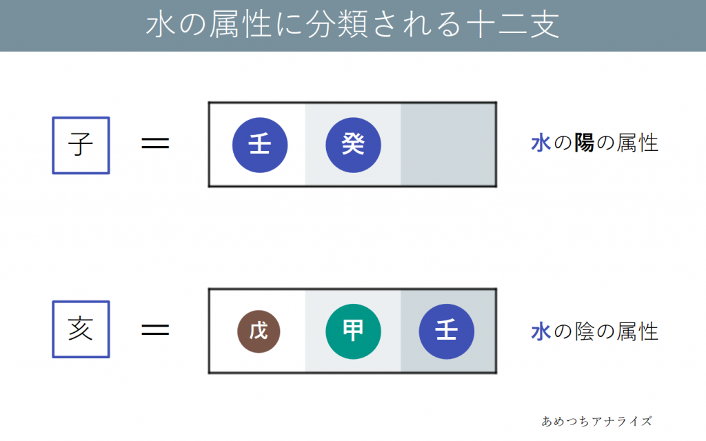 ・「子」は壬と癸から成る十二支で、水の陽の属性に分類されます