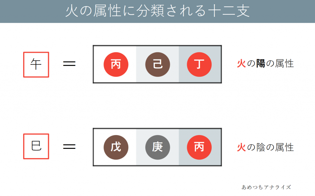 ・「午」は丙と己と丁から成る十二支で、火の陽の属性に分類されます