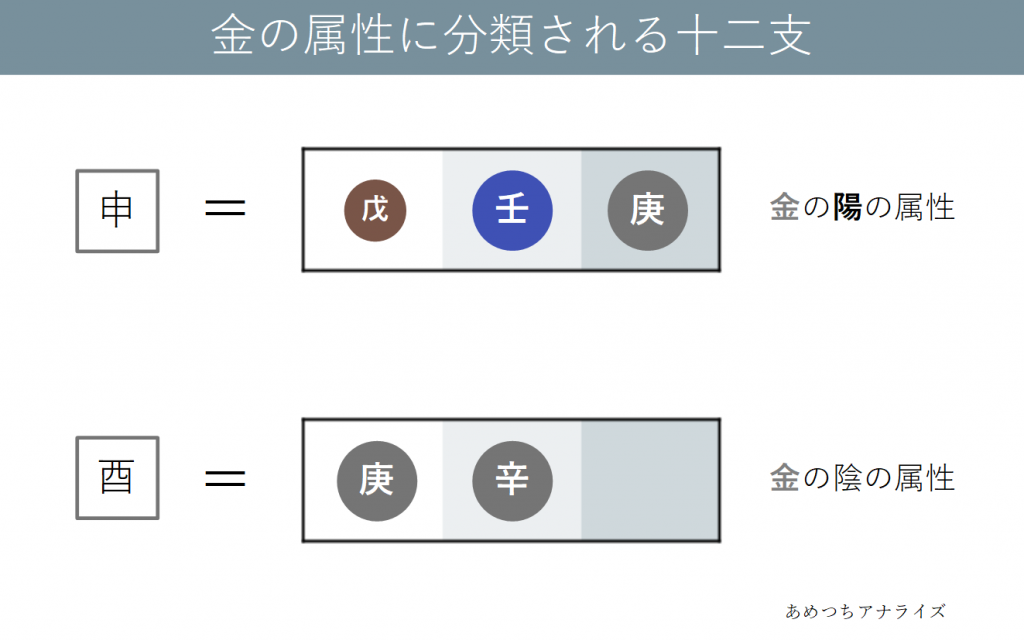 ・「申」は戊と壬と庚から成る十二支で、金の陽の属性に分類されます