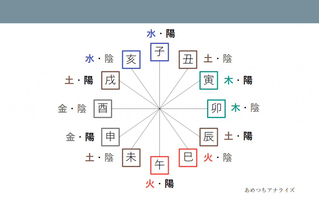 それぞれの十二支には陰陽・五行が配当されています。