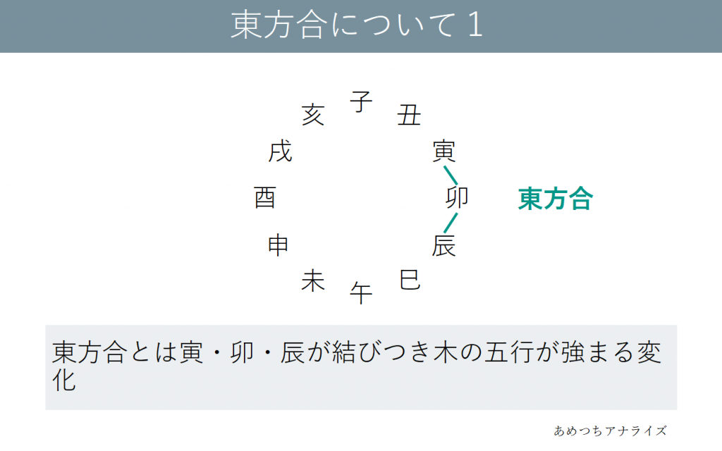 寅・卯・辰が結びつき木の五行が強まる変化を東方合といいます。