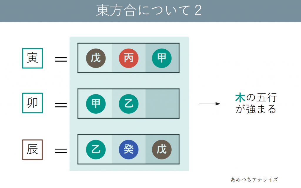 寅・卯は木の属性の十二支で、辰は木の五行を含んだ土の属性の十二支です。この3つが結びつくことで木の五行が極端に強くなります。