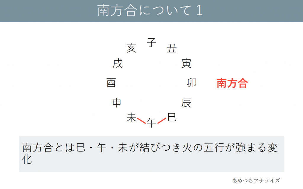 巳・午・未が結びつき火の五行が強まる変化を南方合といいます。