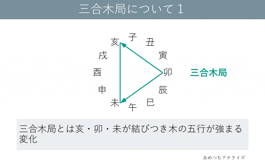 亥・卯・未が結びつき木の五行が強まる変化を三合木局といいます。