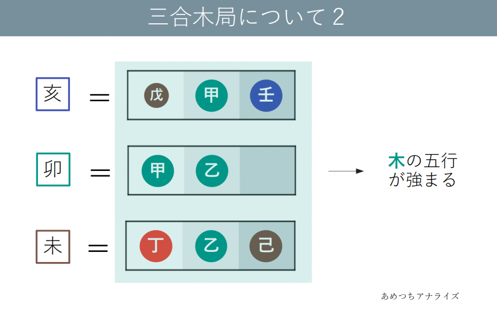 卯は木の属性の十二支であり、亥・未は異なる属性ですが共通して蔵干の中気に木の五行を持っています。卯を中心にこの3つの十二支が結びつくことで、木の五行が極端に強くなります。