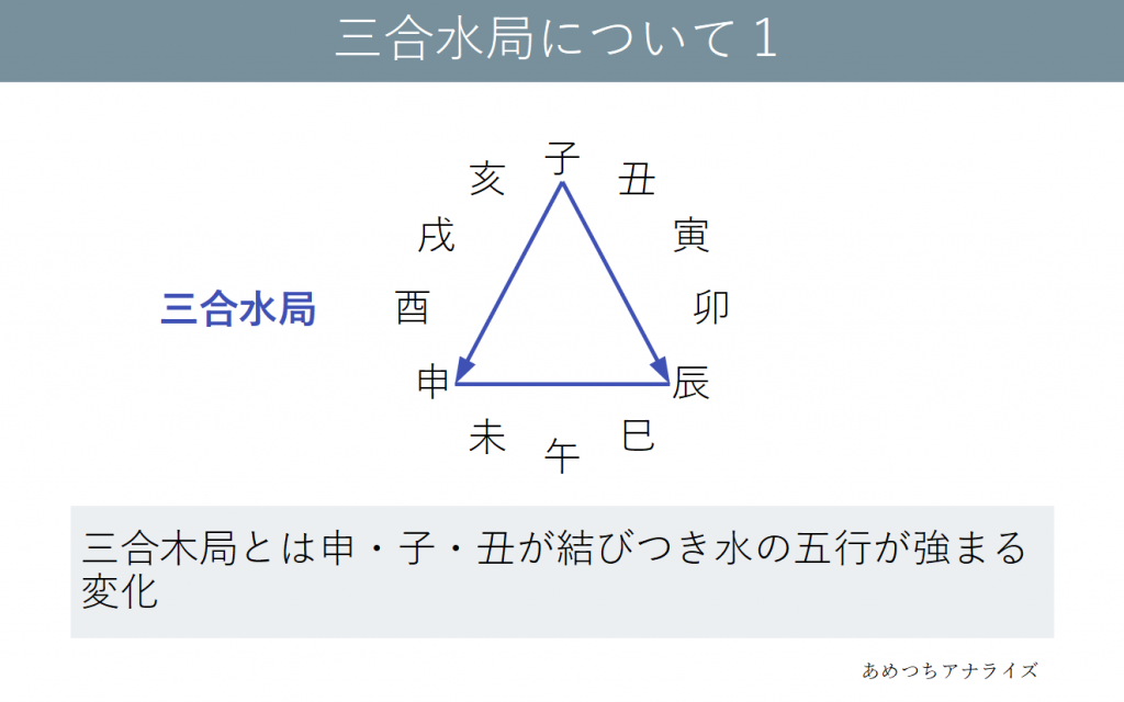 子は水の属性の十二支であり、申・辰は異なる属性ですが共通して蔵干の中気に水の五行を持っています。子を中心にこの3つの十二支が結びつくことで、水の五行が極端に強くなります。