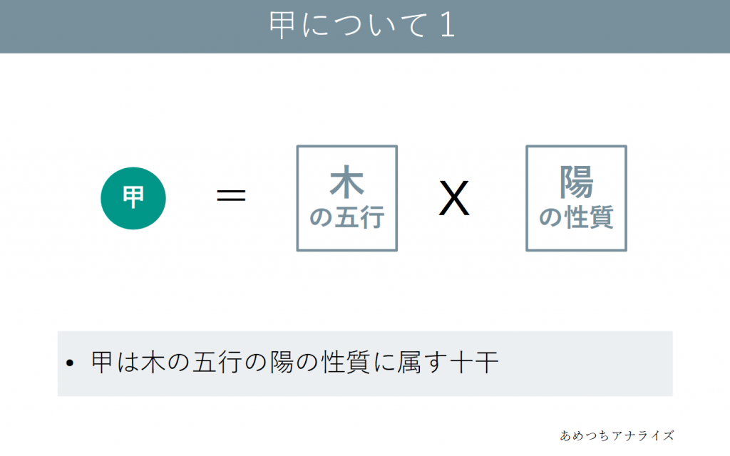 甲とは、五行は「木」陰陽は「陽」に属す十干で、その性質は樹木に例えられます。