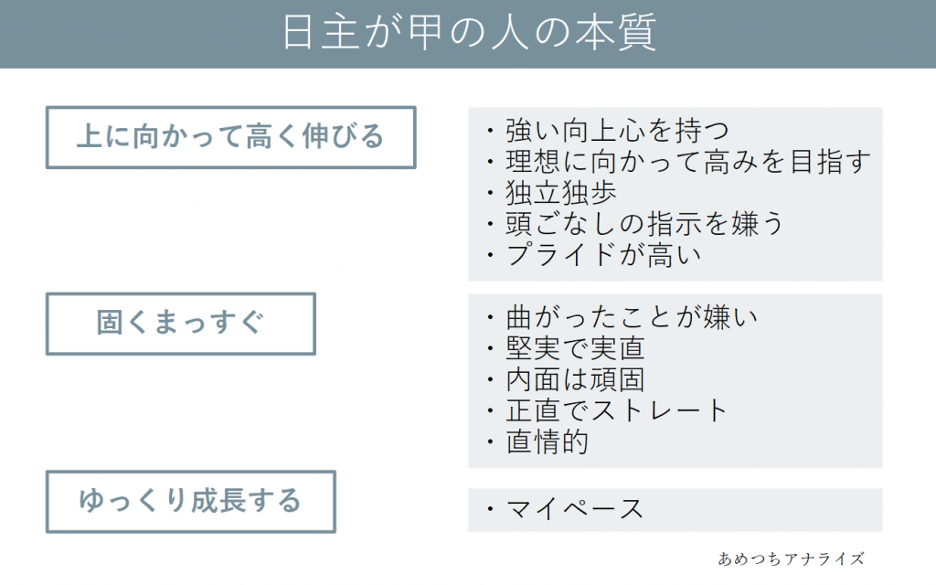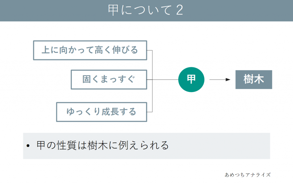日主の状態によって性格に若干違いが出ますが、今回は甲の基本事項について先程のキーポイントごとにまとめました。