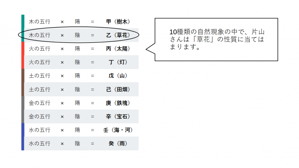片山さんの場合は「草花の性質」×「強い火の五行」なので、その性格や人生傾向は「燃え上がる草花の性質」となります。