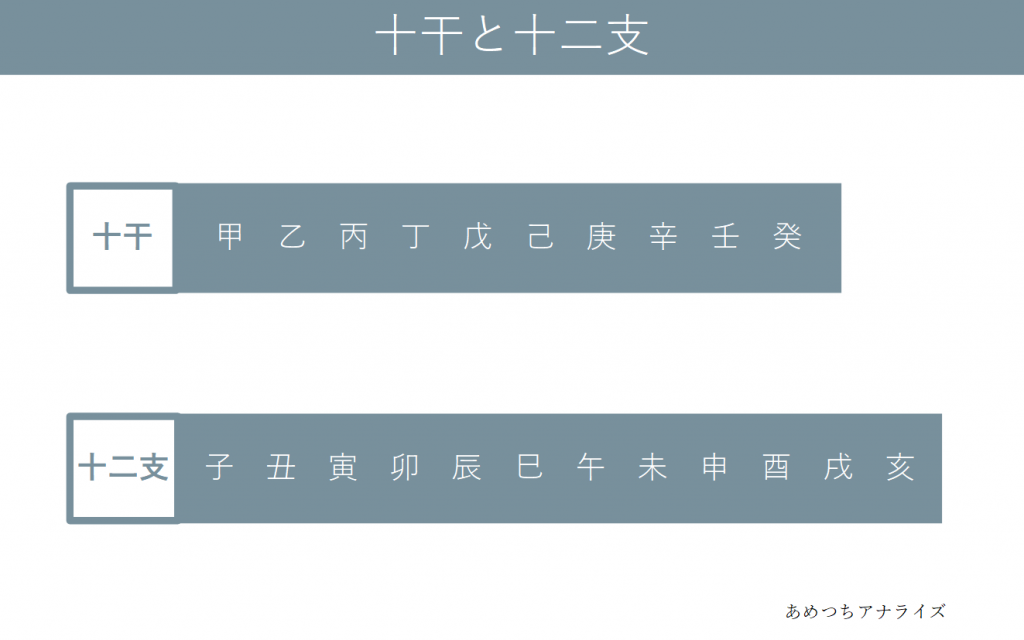 十干とは、甲・乙・丙・丁・戊・己・庚・辛・壬・癸の10種類のことで、 十二支とは、子・丑・寅・卯・辰・巳・午・未・申・酉・戌・亥の12種類のことです。