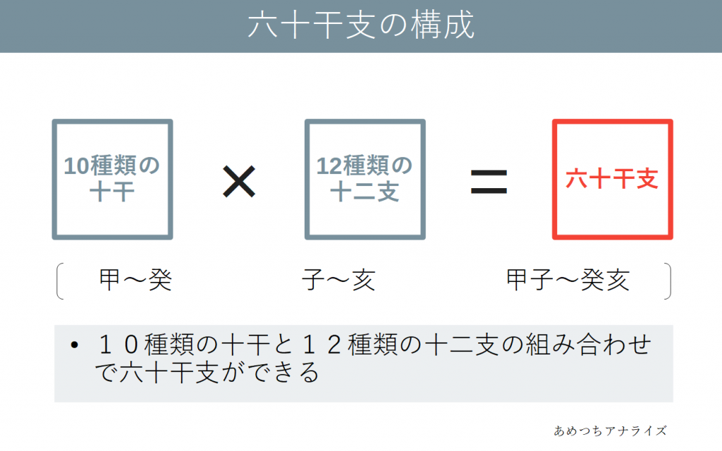 六十干支は、甲子から始まり、乙丑・丙寅・丁卯と順番に続き、最後は癸亥で終わります。