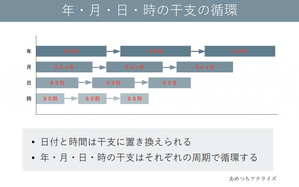 癸亥で1サイクルが終わると、次はまた甲子に戻り、同じように60通りが繰り返され循環していきます。