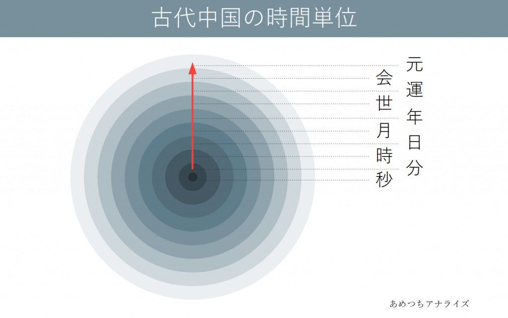 時の下には「分・秒」、年の上には「世・運・会・元」といった時間単位があり、それぞれ六十干支の循環を繰り返しています。