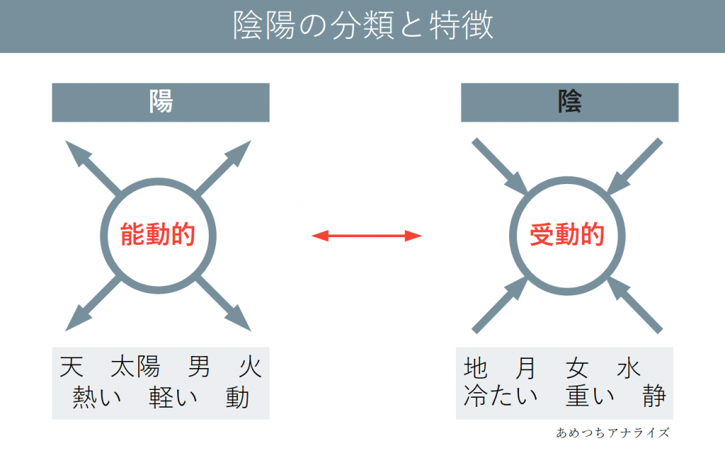 以下は一部に過ぎませんが、陰陽の具体的な分類とその特徴を表しました。陰と陽の2つを比べると、陽はより能動的で陰はより受動的要素となっています。