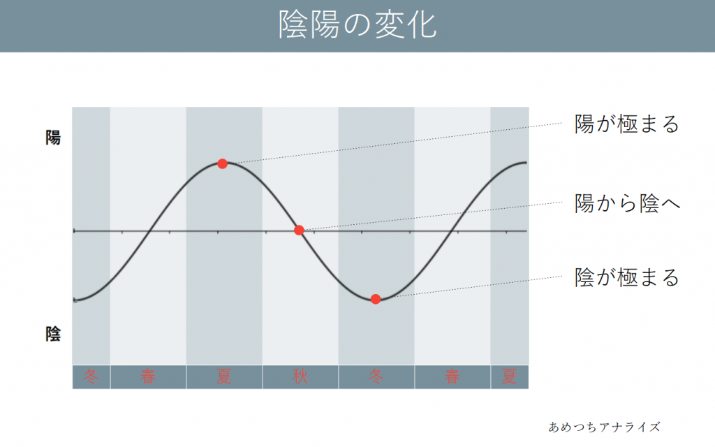 これを春夏秋冬に当てはめてみると、陽が極まる夏から徐々に陰が増して秋になり、陰が極まって冬になるとそこからまた陽が増して春になる、という陰陽の変化のサイクルがイメージしやすいと思います。