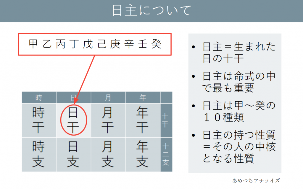 ※上記のサイトで命式を出した場合、「日柱」と「天干」が交差する場所の十干が日主になります。
