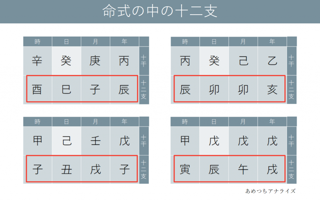 四柱推命の命式の中には4つの十二支が含まれます。十干と同様に、この4つは全て異なる場合もあれば、同じ属性のものが偏っている場合もあります。