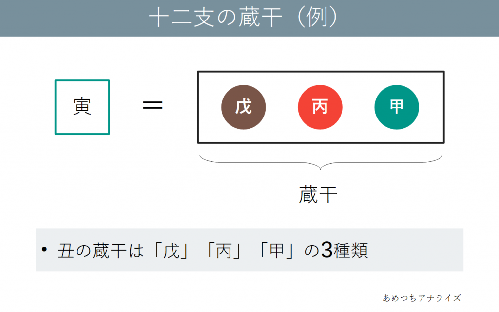 四柱推命では、ひとつの十二支の中に2~3個の十干が含まれると考えます。これは「十二支が十干を内蔵する」ということで「蔵干(ぞうかん)」と呼ばれます。
