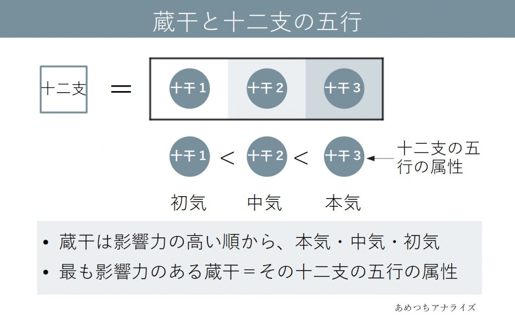 蔵干である2~3個の十干は、いずれも十二支の性質に影響を与えますが、その影響力には度合いがあります。