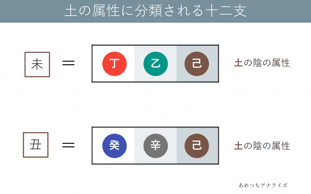 ・「丑」は癸と辛と己から成る十二支で、土の陰の属性に分類されます