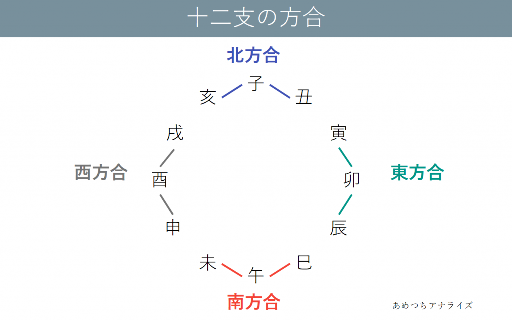方合(ほうごう)とは「類似した属性を持つ3つの十二支が結びつき、その属性の五行が極端に強まる」という法則です。