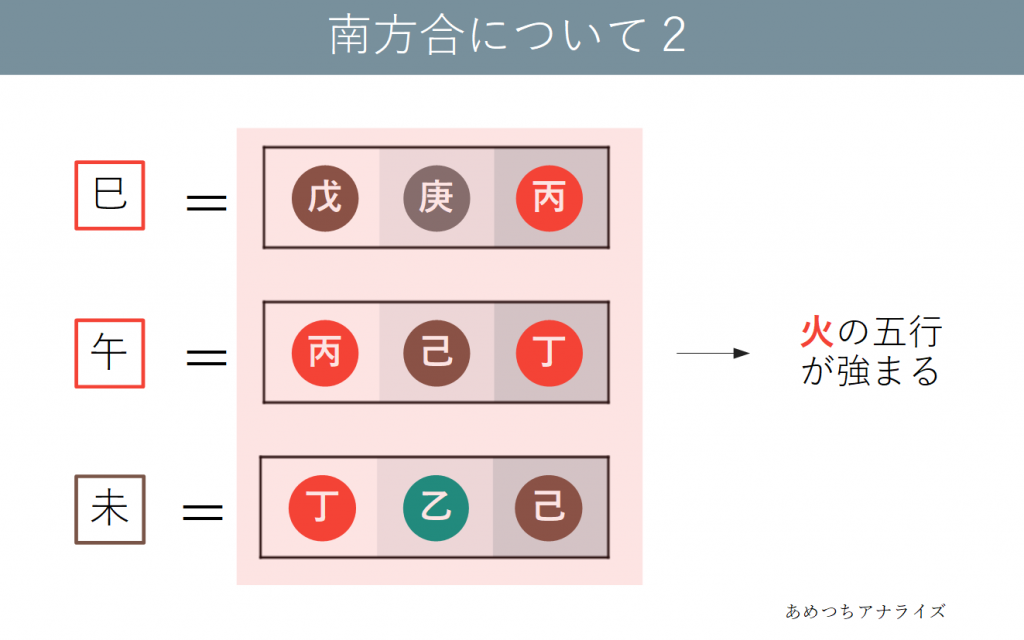 巳・午は火の属性の十二支で、未は火の五行を含んだ土の属性の十二支です。この3つが結びつくことで火の五行が極端に強くなります。