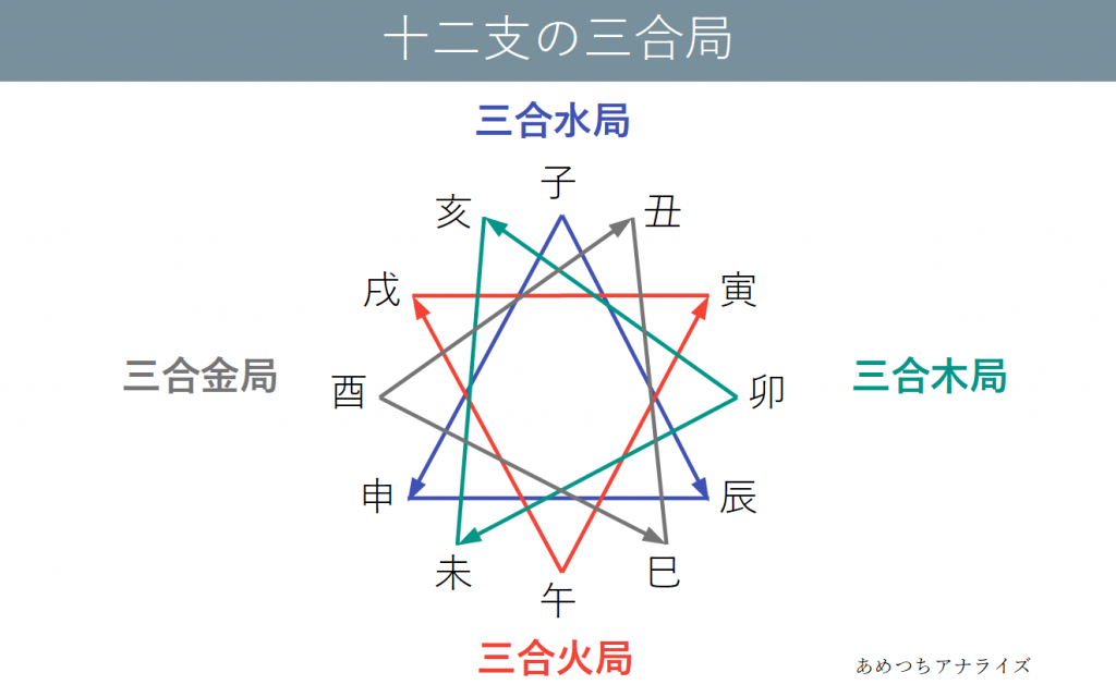 十二支を円形に並べたときに、正三角形をつくる3つの十二支が結びつく関係が三合局です。