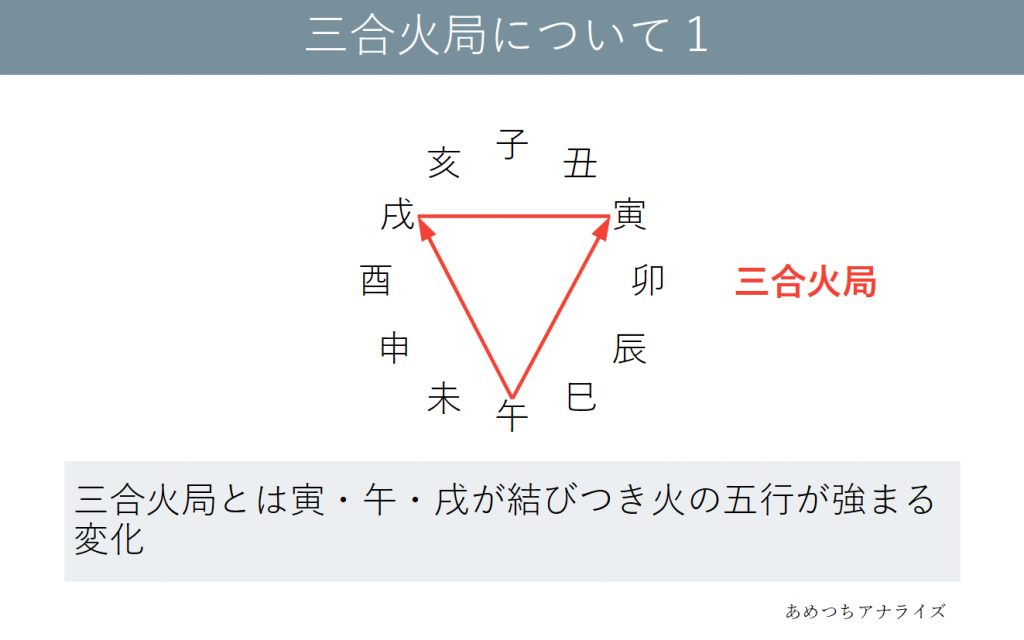 寅・午・戌が結びつき火の五行が強まる変化を三合火局といいます。