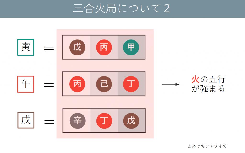 午は火の属性の十二支であり、寅・戌は異なる属性ですが共通して蔵干の中気に火の五行を持っています。午を中心にこの3つの十二支が結びつくことで、火の五行が極端に強くなります。