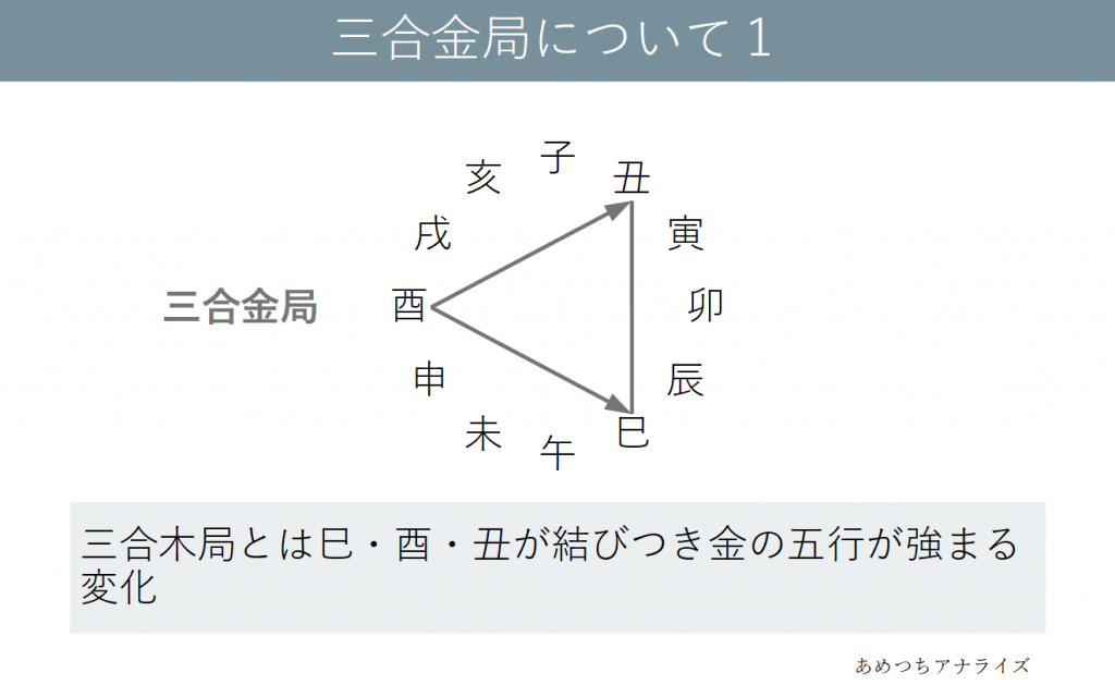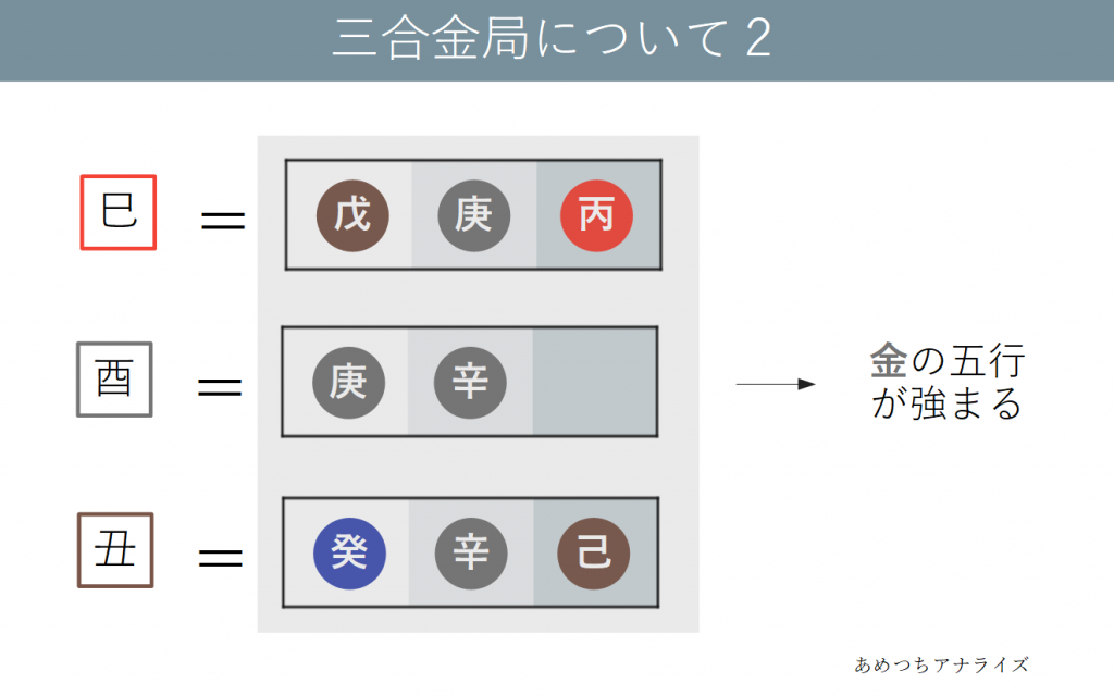 酉は金の属性の十二支であり、巳・丑は異なる属性ですが共通して蔵干の中気に金の五行を持っています。酉を中心にこの3つの十二支が結びつくことで、金の五行が極端に強くなります。