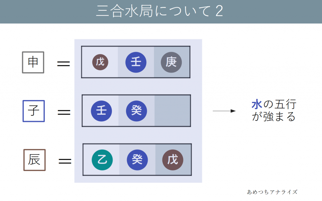 子は水の属性の十二支であり、申・辰は異なる属性ですが共通して蔵干の中気に水の五行を持っています。子を中心にこの3つの十二支が結びつくことで、水の五行が極端に強くなります。